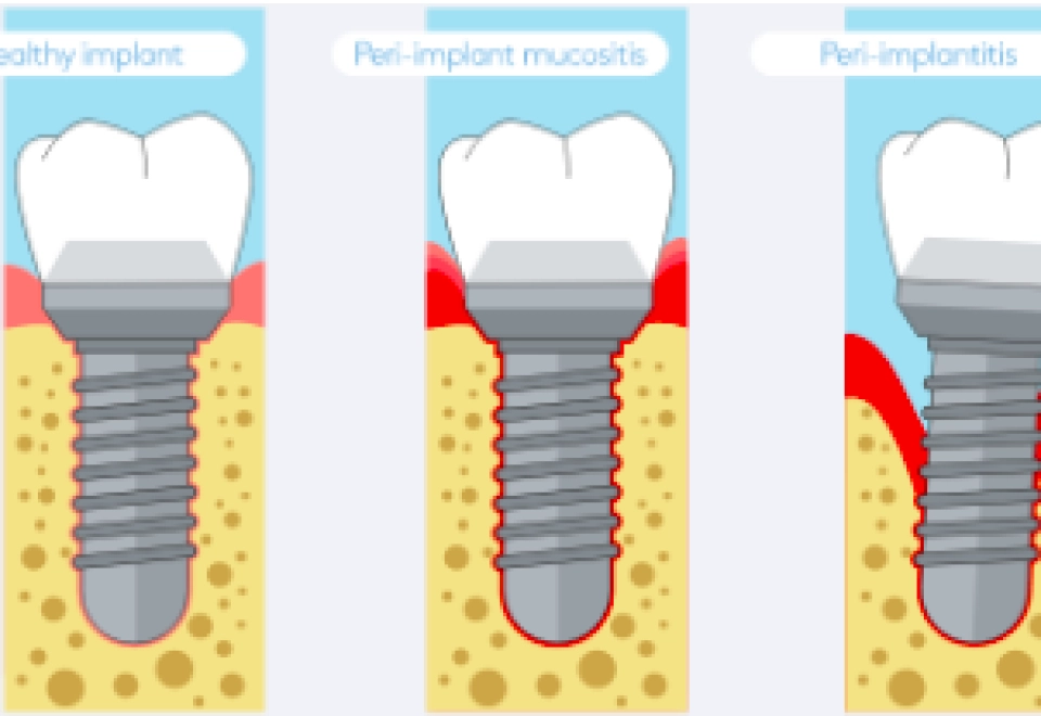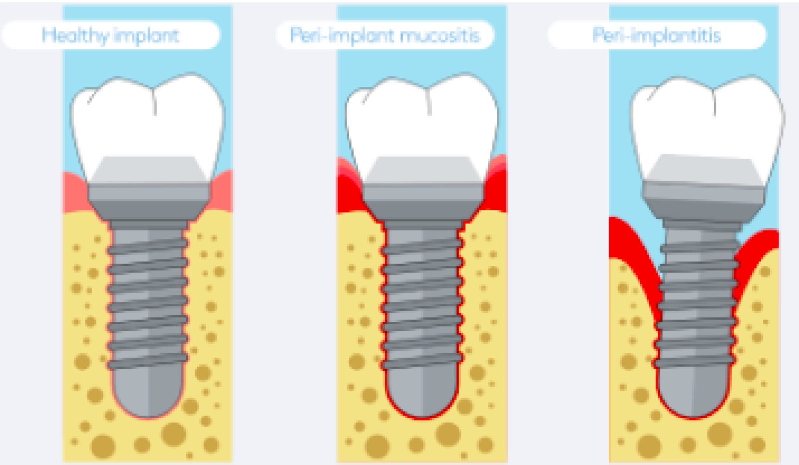 Parodontitis kan ook ontstaan rondom een implantaat. Dit heet peri-implantitis. Een implantaat is immers een ''kunstwortel''. Ook rondom een implantaat kan ontsteking ontstaan en kaakbot afbreken. Door regelmatig implantaten te laten reinigen door de mondhygiënist worden ook hier problemen voorkomen.